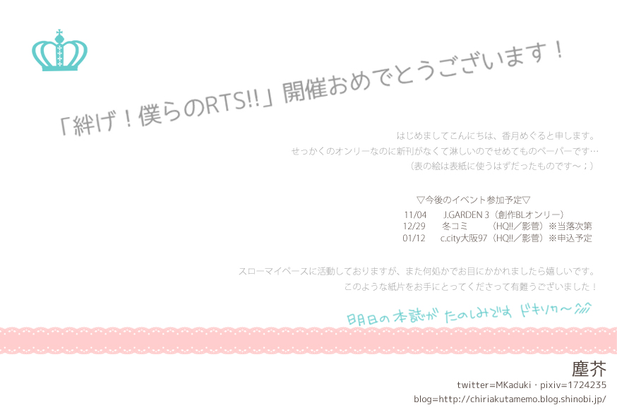 10/6開催のHQオンリー「絆げ!僕らのRTS!!」の配置が出たので、とりあえずのお知らせです。